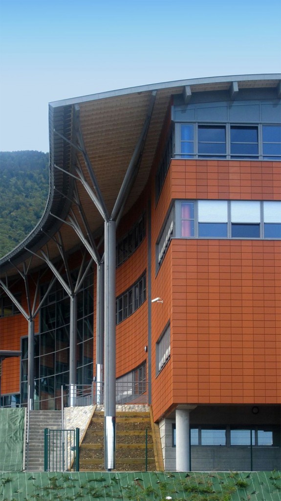 Projet du collège de Péron d’une capacité d’accueil de 600 places. Le collège bénéficie en annexe de six logements de fonction et de deux studios organisés en terrasses décalées. Les idées principales du projet étaient de tirer profit des qualités du site naturel et de se protéger des nuisances climatiques locales pour créer un volume architectural adéquat. Le bâtiment a une forme d’amphithéâtre et bénéficie d’une large ouverture au sud vers les ALPES en faisant le dos rond au Jura, pour se protéger du vent du nord.