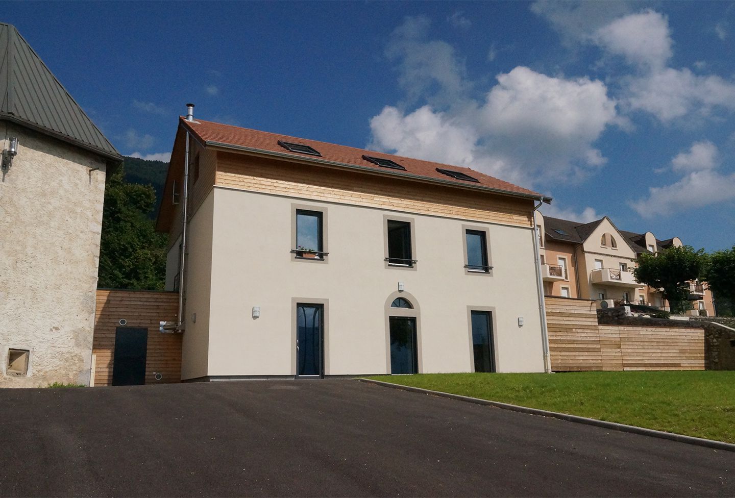 Projet de réhabilitation de l’ancienne cure dans le centre de la commune de Confort. L’objectif était la réalisation d’un Etablissement Recevant du Public (ERP) sur la partie rez-de-chaussée et deux appartements sur la partie haute du bâtiment locatifs en duplex. Ce qui avait nécessité le rehaussement du bâtiment existant. Ce projet participe également à des enjeux de valorisation du patrimoine bâti vacant et de densification du centre du village. Les deux points essentiels mis en avant sont la valorisation des filières courtes au travers notamment de la fourniture de bois par la commune et la rénovation énergétique performante du bâtiment.
