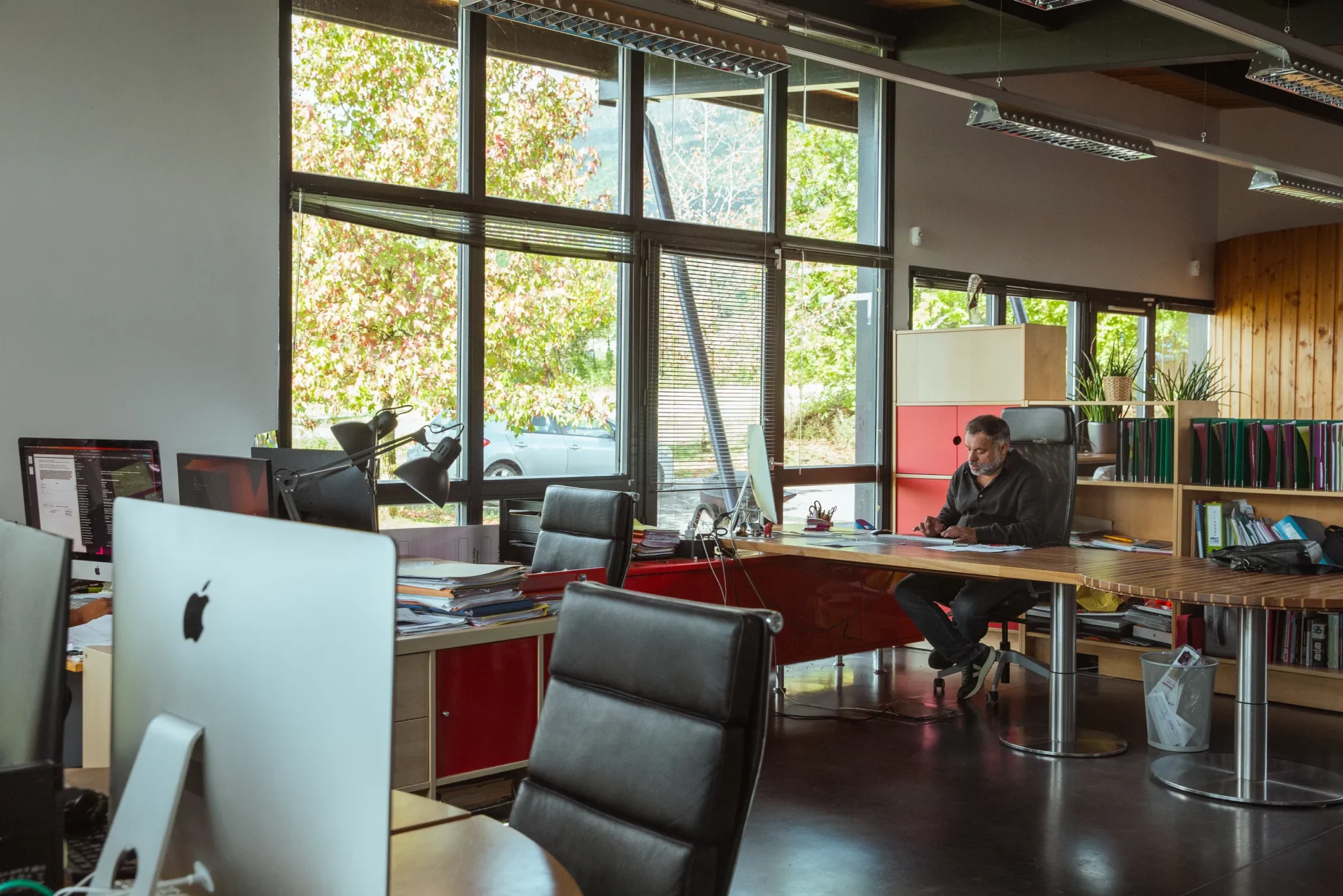 Baignés de lumière naturelle, les bureaux offrent un cadre de travail agréable, dans lequel nous avons plaisir à exercer notre métier depuis bientôt trente ans. Les deux toitures monopentes qui se chevauchent donnent son caractère au bâtiment : elles structurent les volumes, ouvrent les vues et assurent une protection solaire naturelle.