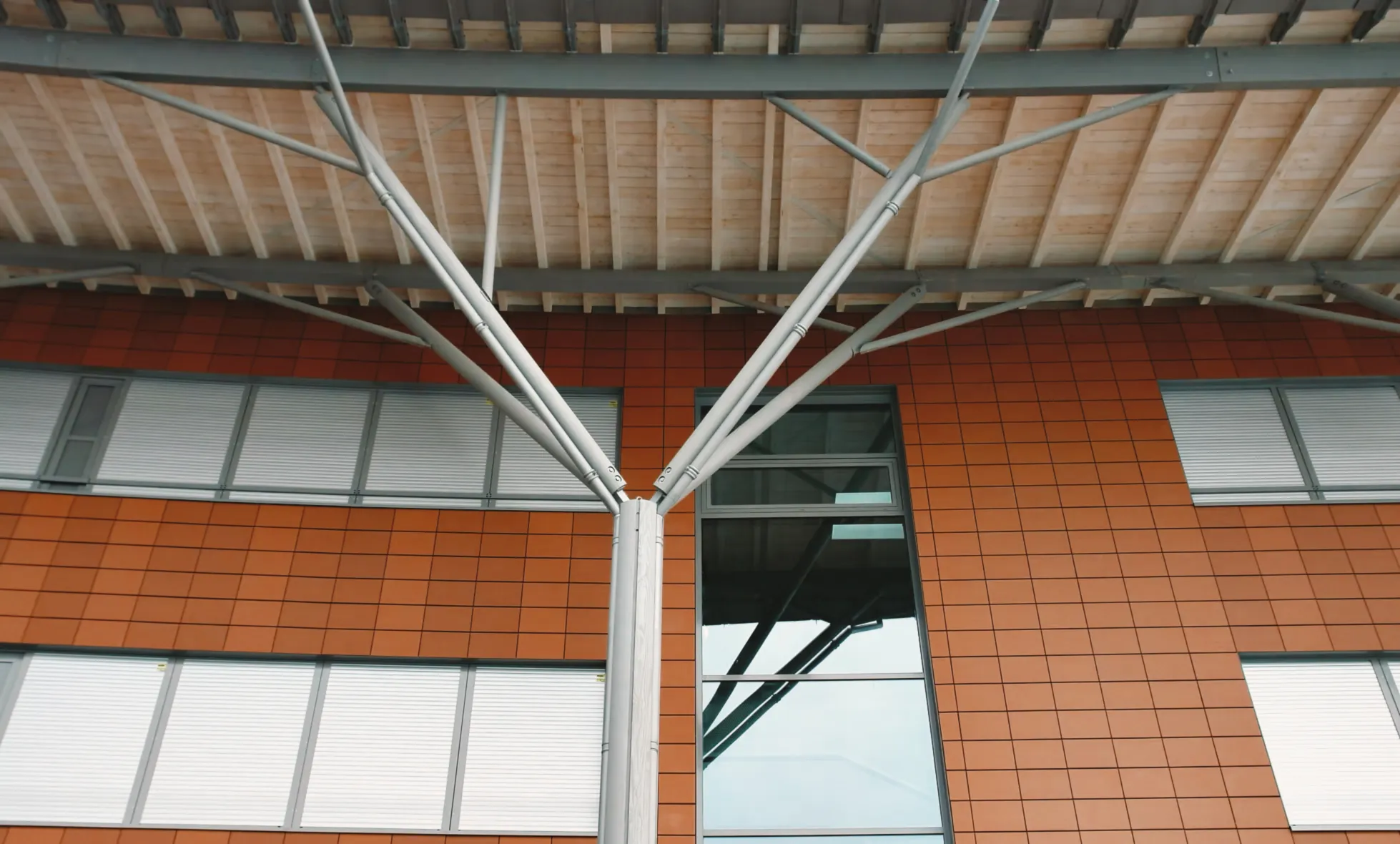 La conception privilégie une enveloppe performante et durable. Le bardage en terre cuite associé à une isolation extérieure assure une bonne inertie, tandis qu’une large façade vitrée orientée au sud réduit les besoins en éclairage artificiel. Au nord, la façade est volontairement plus fermée pour limiter les déperditions thermiques.