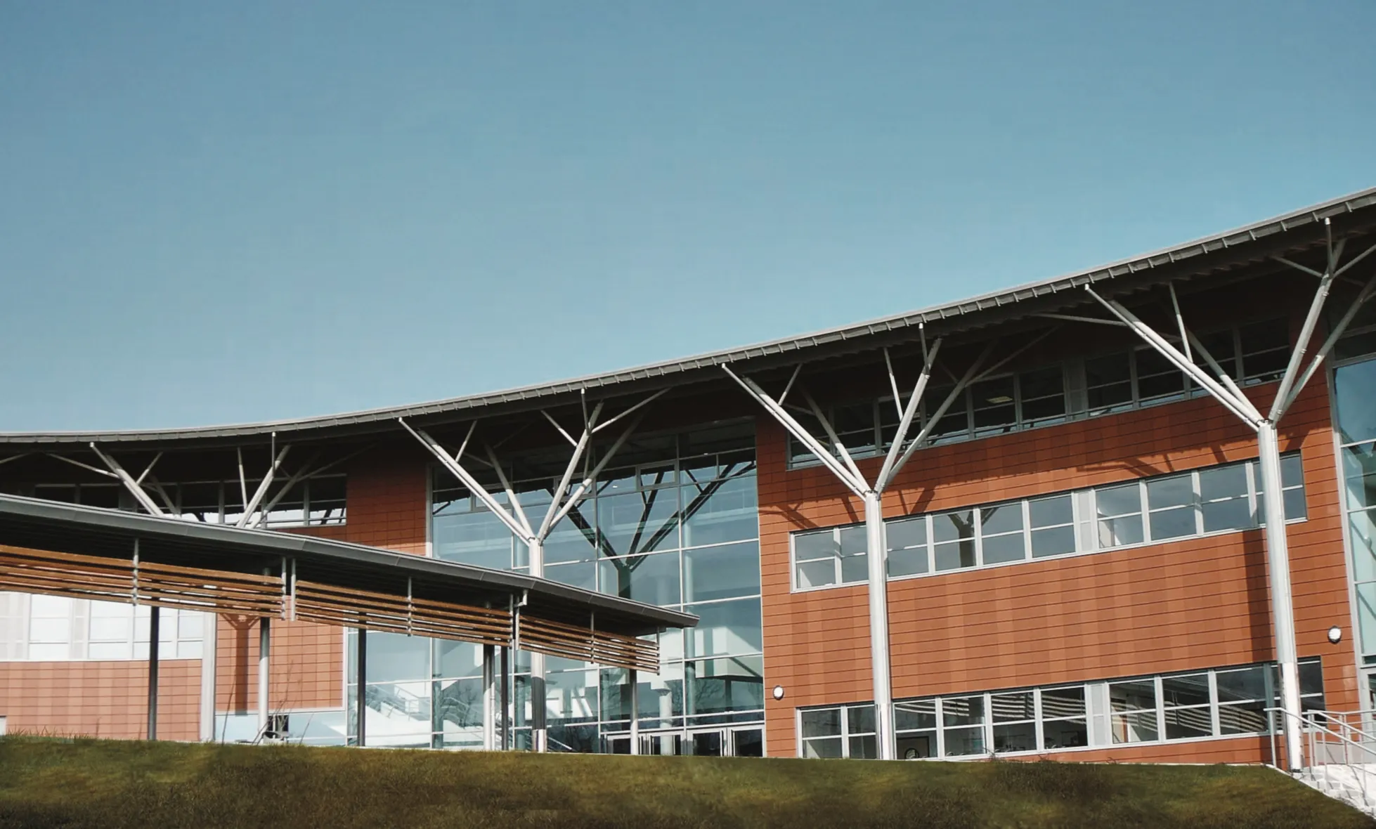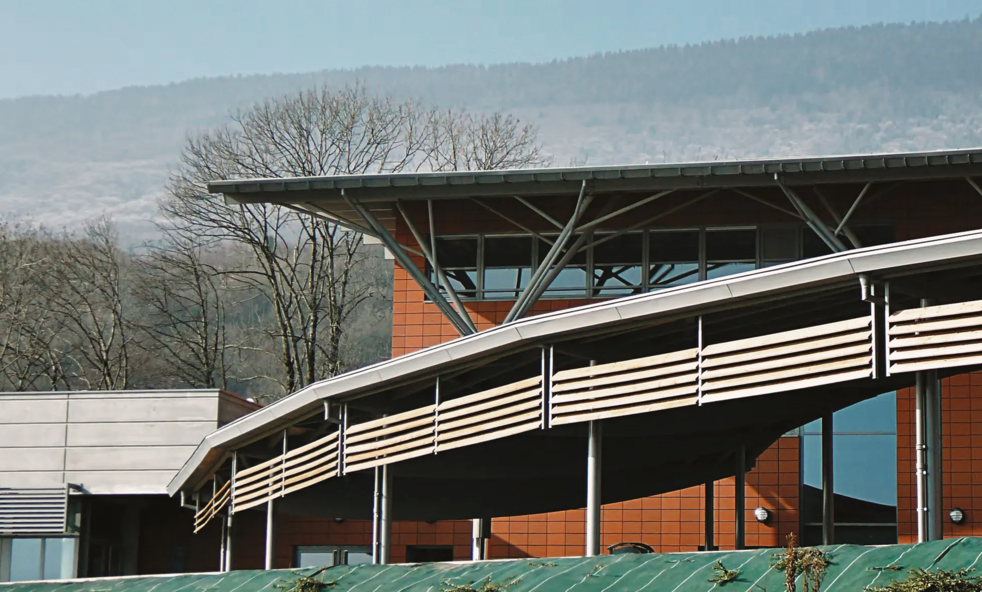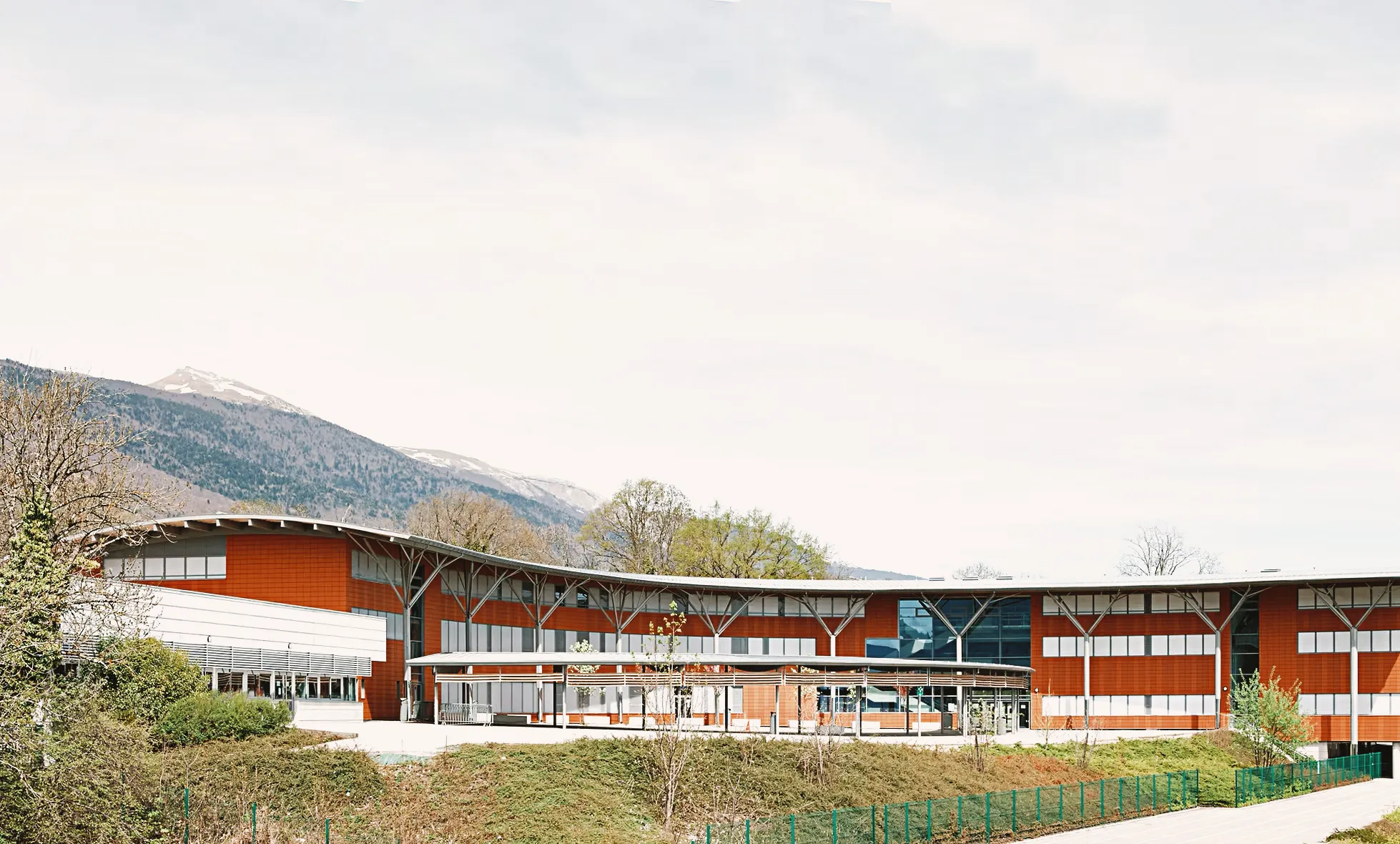 Ce collège de 600 élèves, accompagné de huit logements pour les enseignants, s’inscrit pleinement dans son site grâce à une implantation en courbe. Le bâtiment adopte une forme d’amphithéâtre qui s’ouvre largement sur les panoramas, tandis qu’au nord, il présente un « dos rond » protecteur. Sa façade en parement de brique dialogue avec une série de poteaux-arbres qui soutiennent une toiture courbe en zinc, signature architecturale forte du projet.