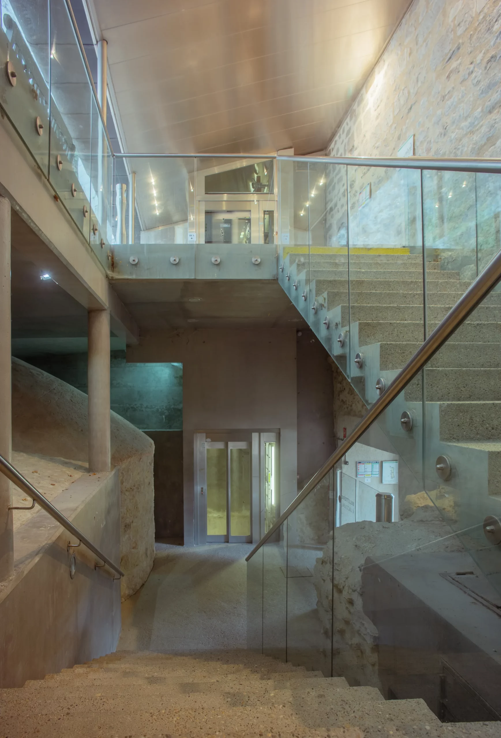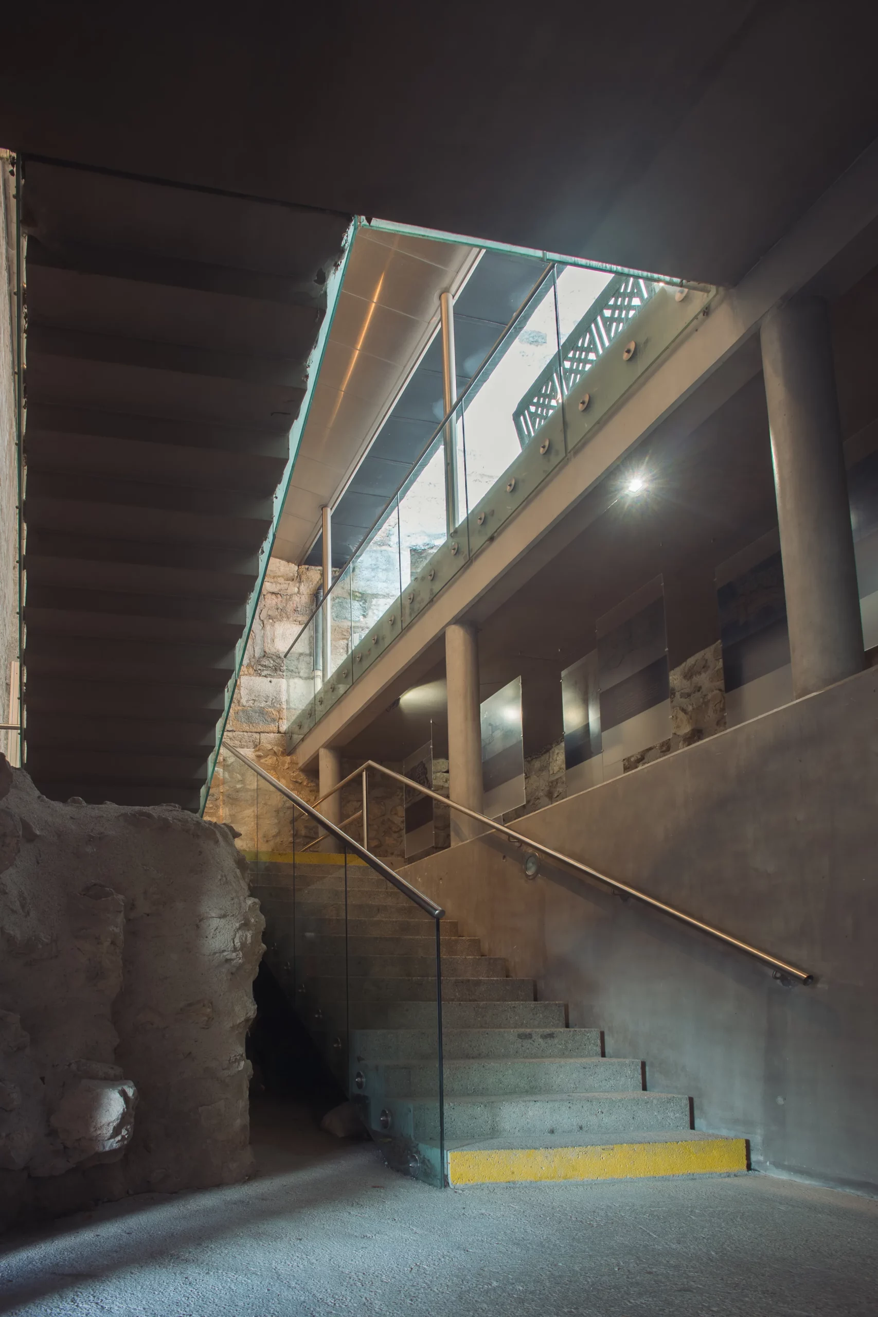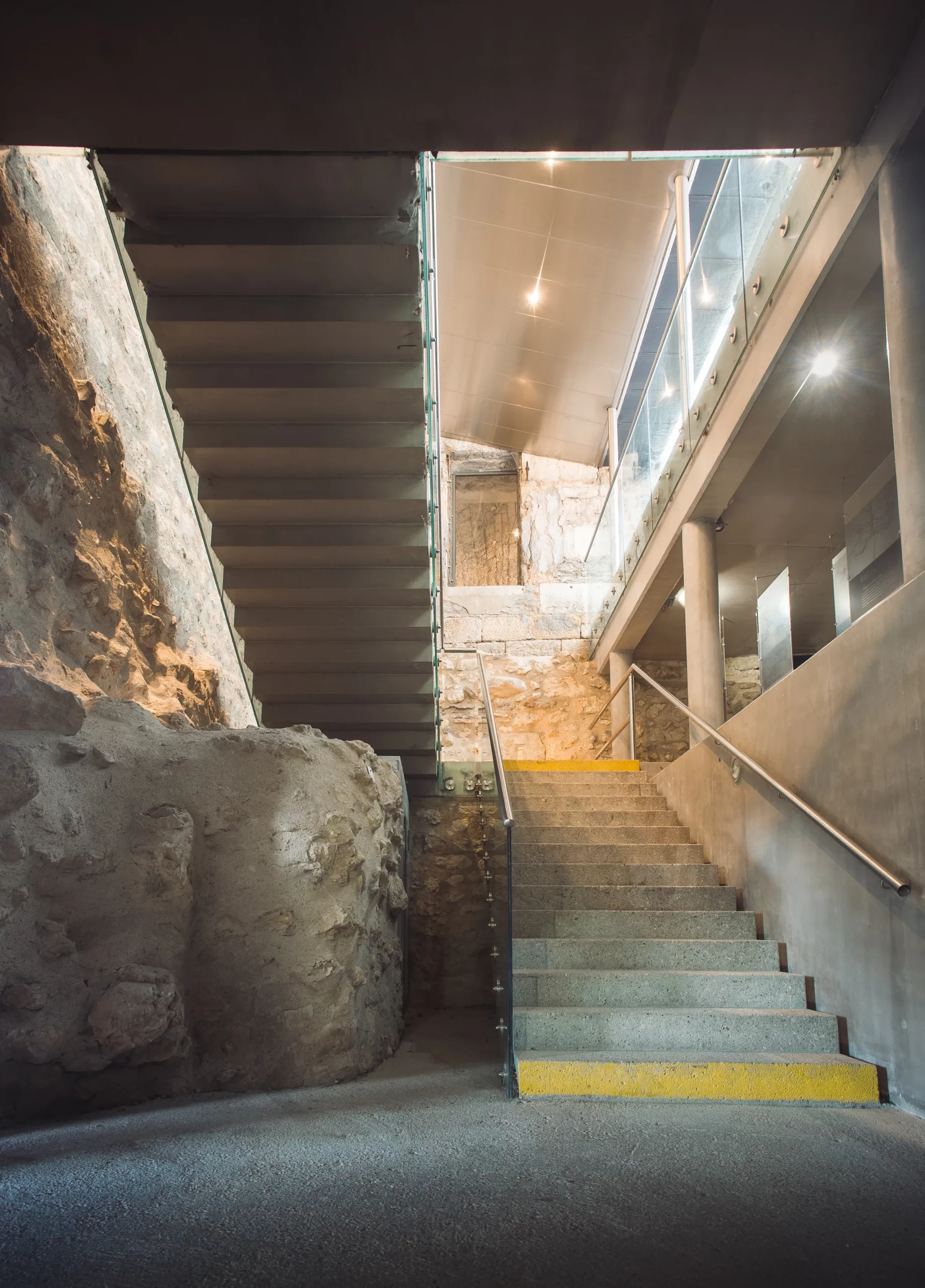 L’escalier s’insère avec discrétion dans l’existant, assurant une circulation claire et lisible entre les différents niveaux. Son dessin contemporain dialogue avec la minéralité du fort, sans chercher à la concurrencer, mais en révélant les volumes et les parcours.