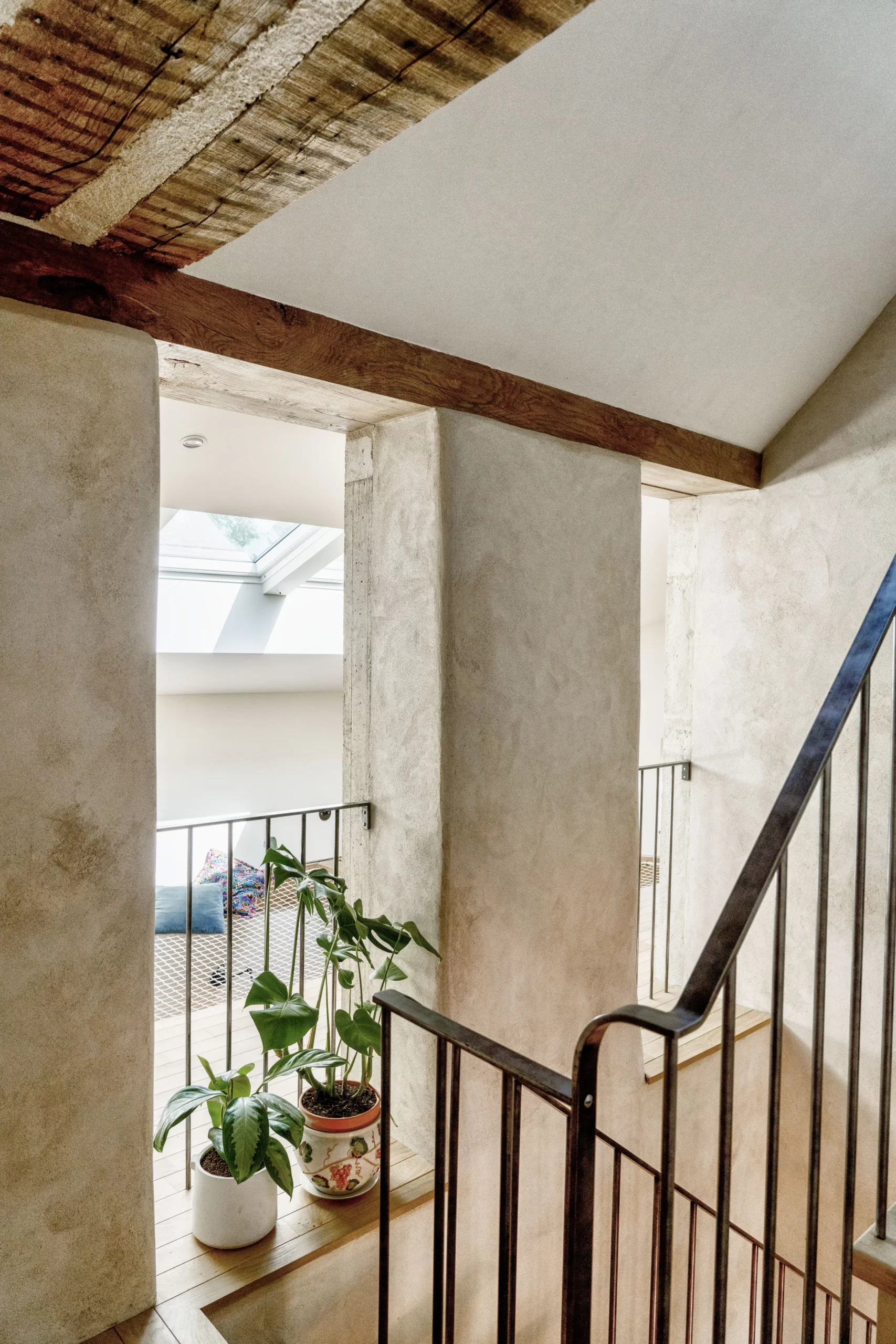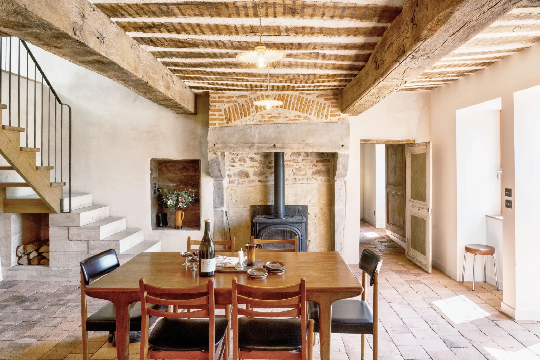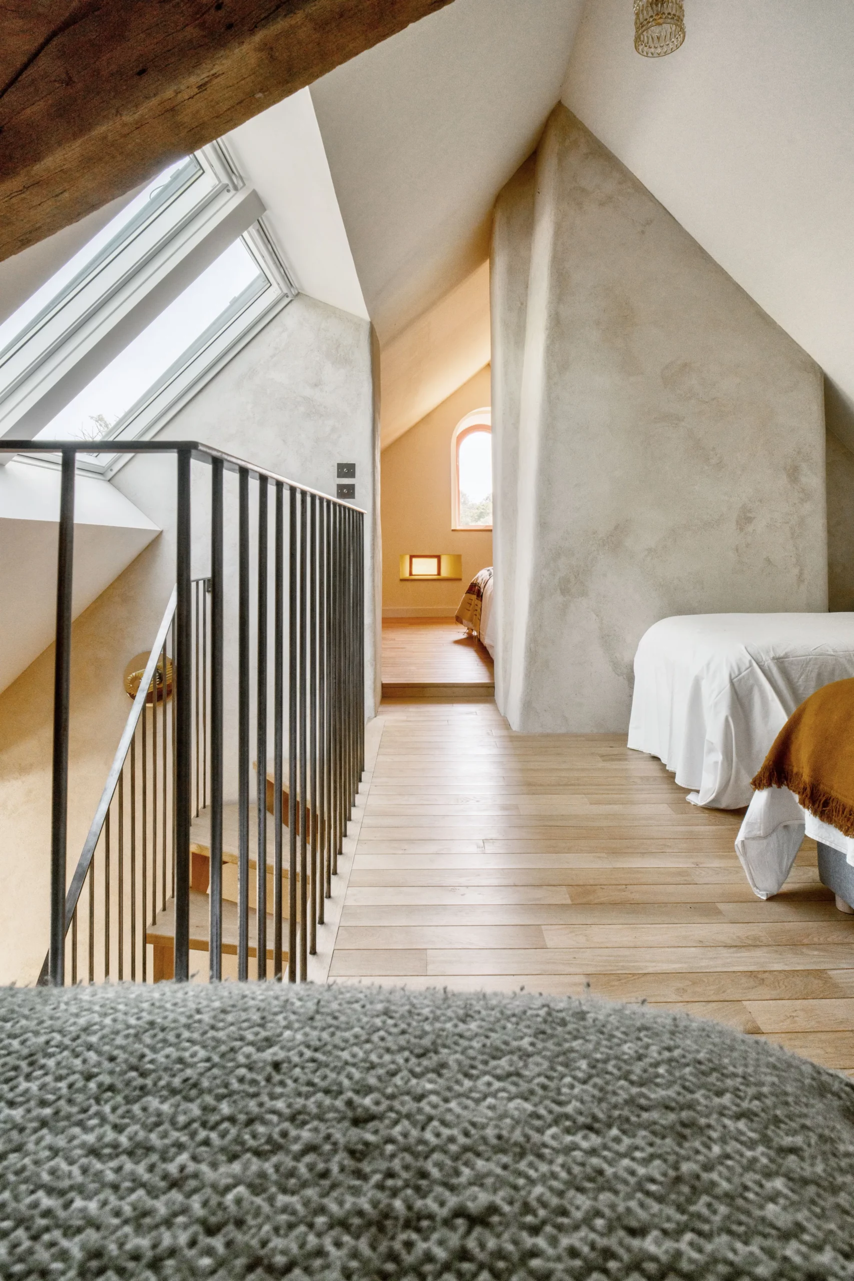 Le travail sur les volumes intérieurs a permis d’ouvrir les perspectives et de créer des continuités visuelles entre les niveaux. Cette approche favorise la diffusion de la lumière naturelle et renforce la lecture des espaces, tout en respectant l’identité et la logique constructive du bâti ancien.