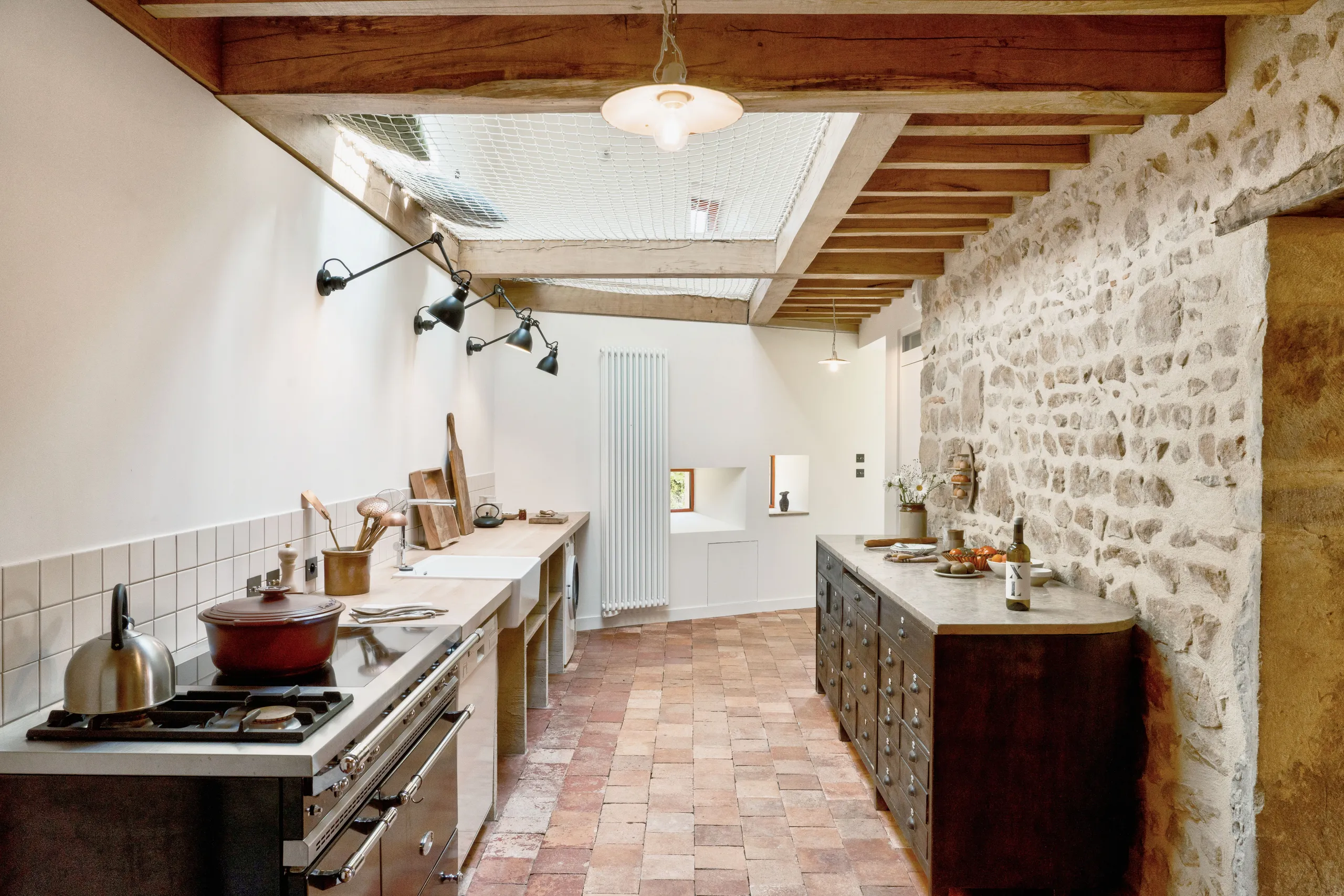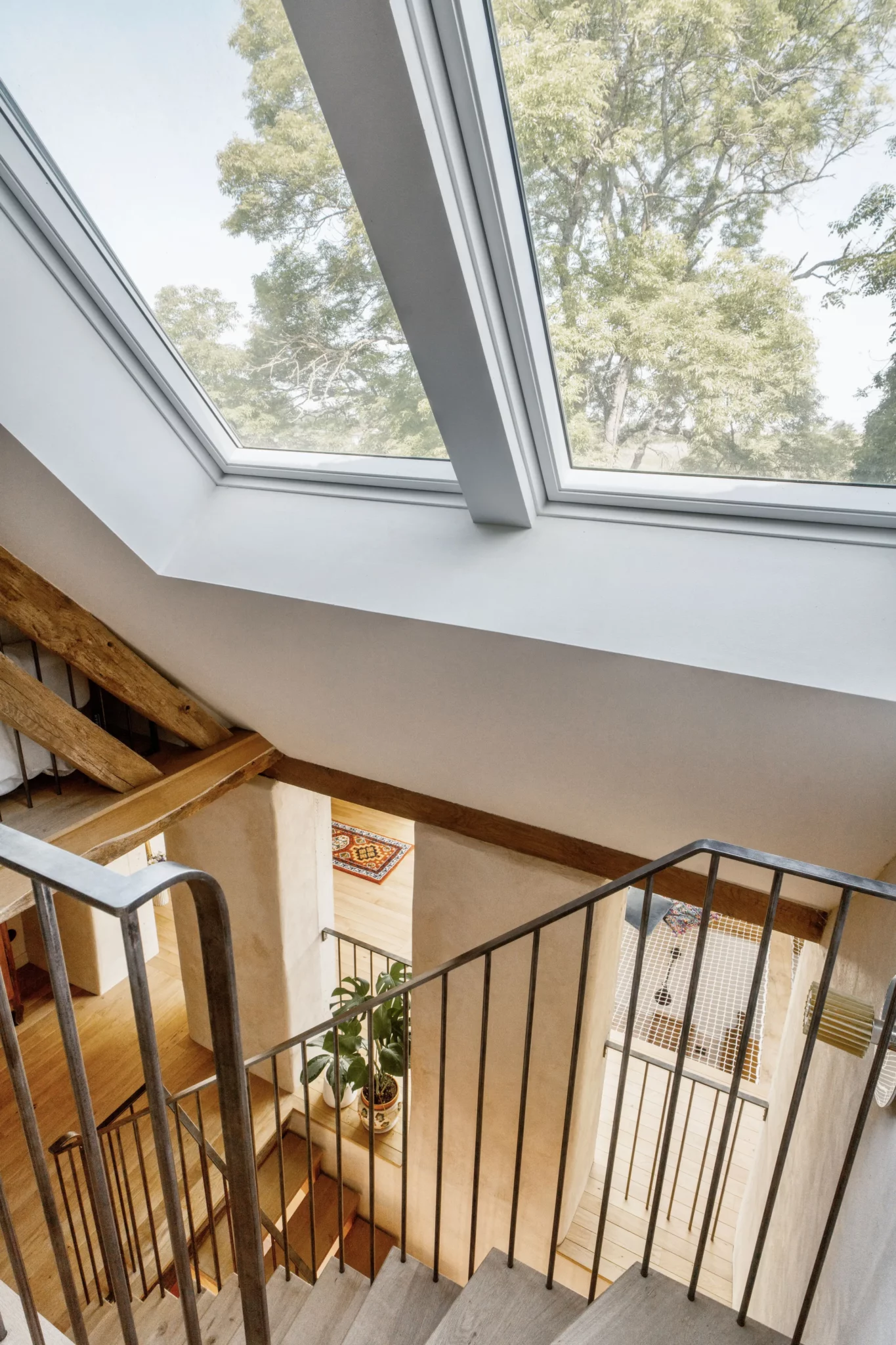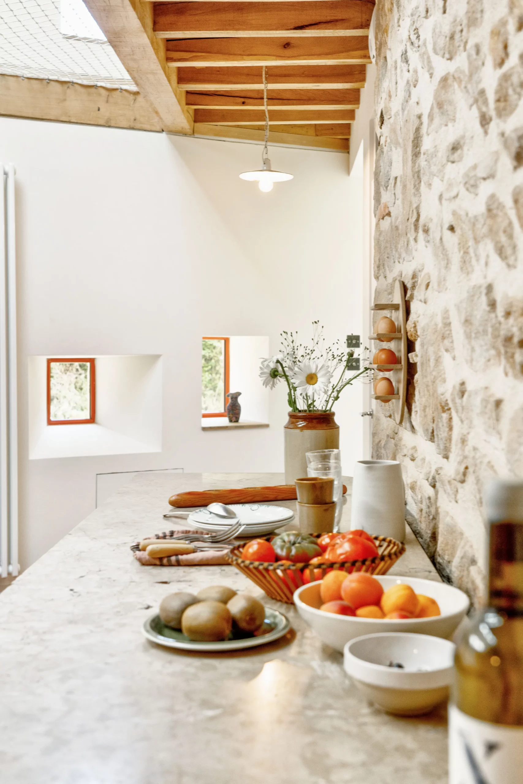 Le travail sur les volumes intérieurs a permis d’ouvrir les perspectives et de créer des continuités visuelles entre les niveaux. Cette approche favorise la diffusion de la lumière naturelle et renforce la lecture des espaces, tout en respectant l’identité et la logique constructive du bâti ancien.