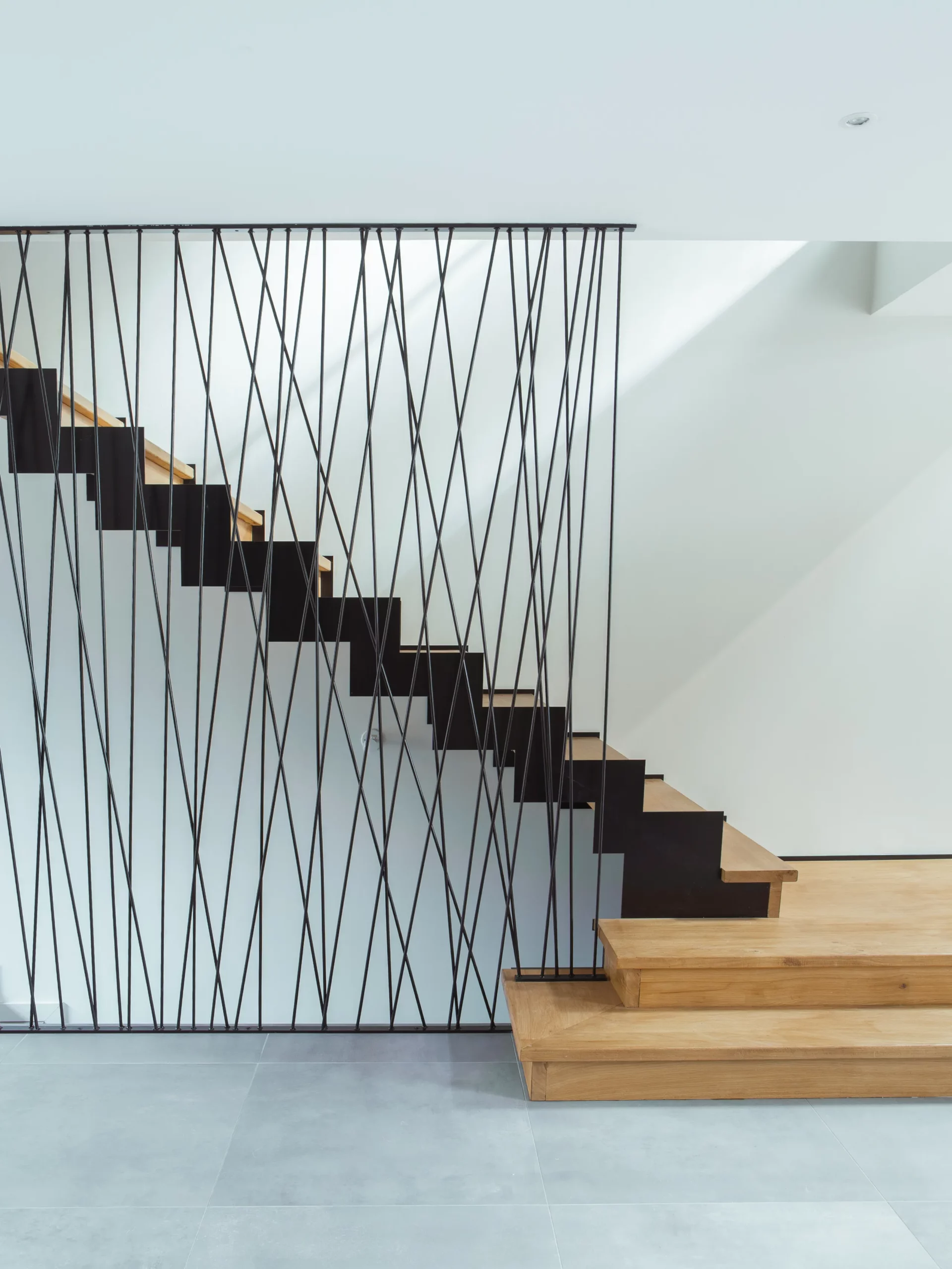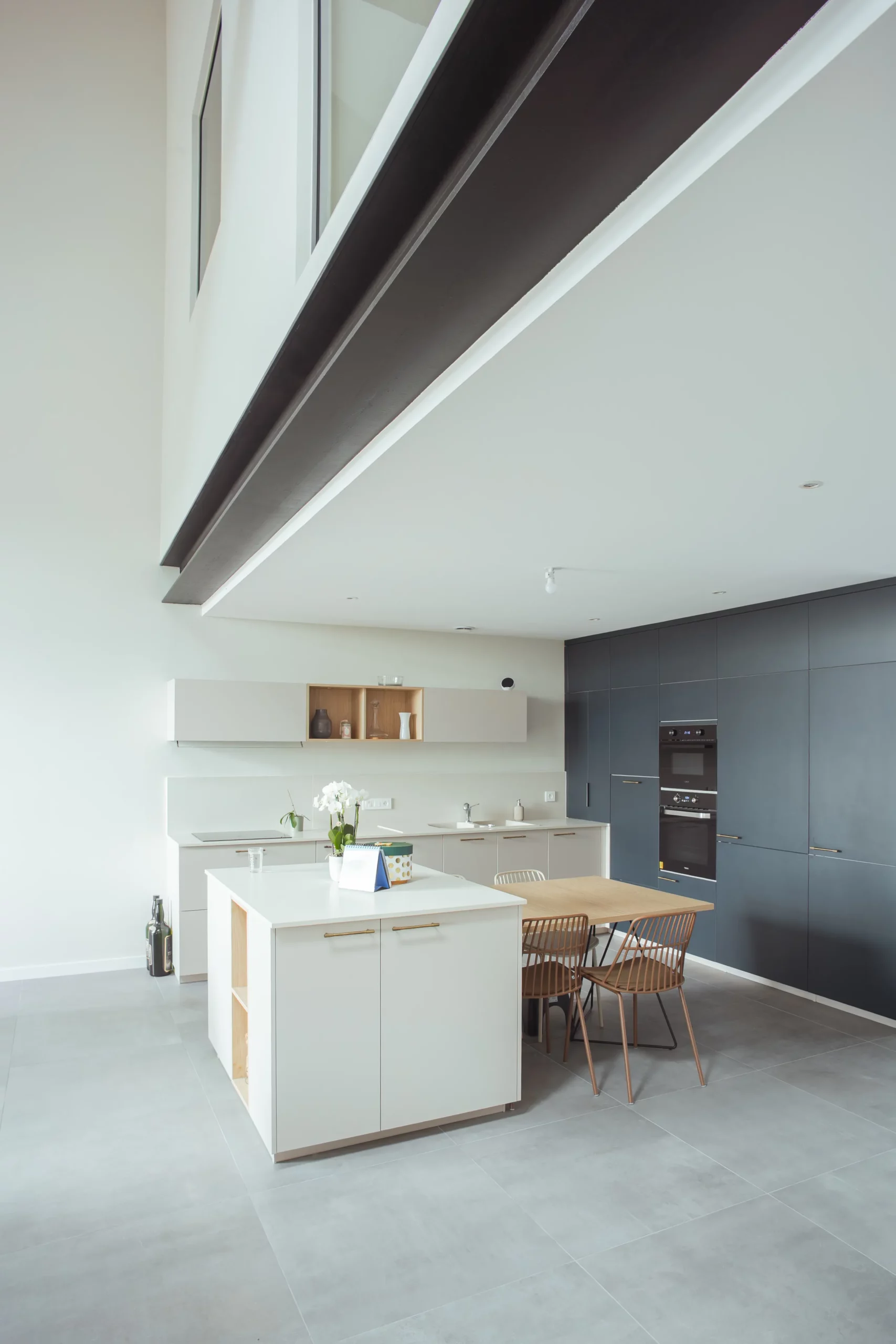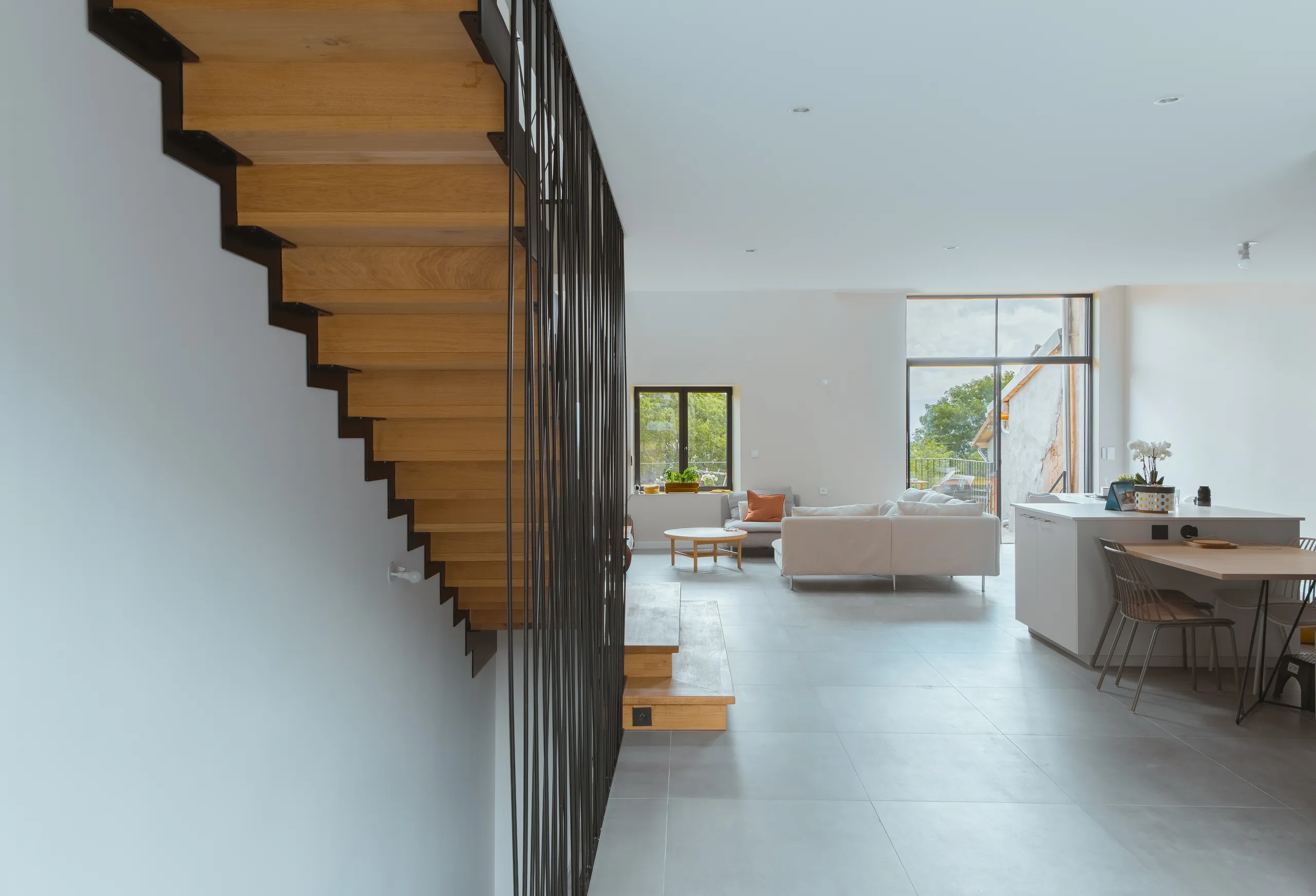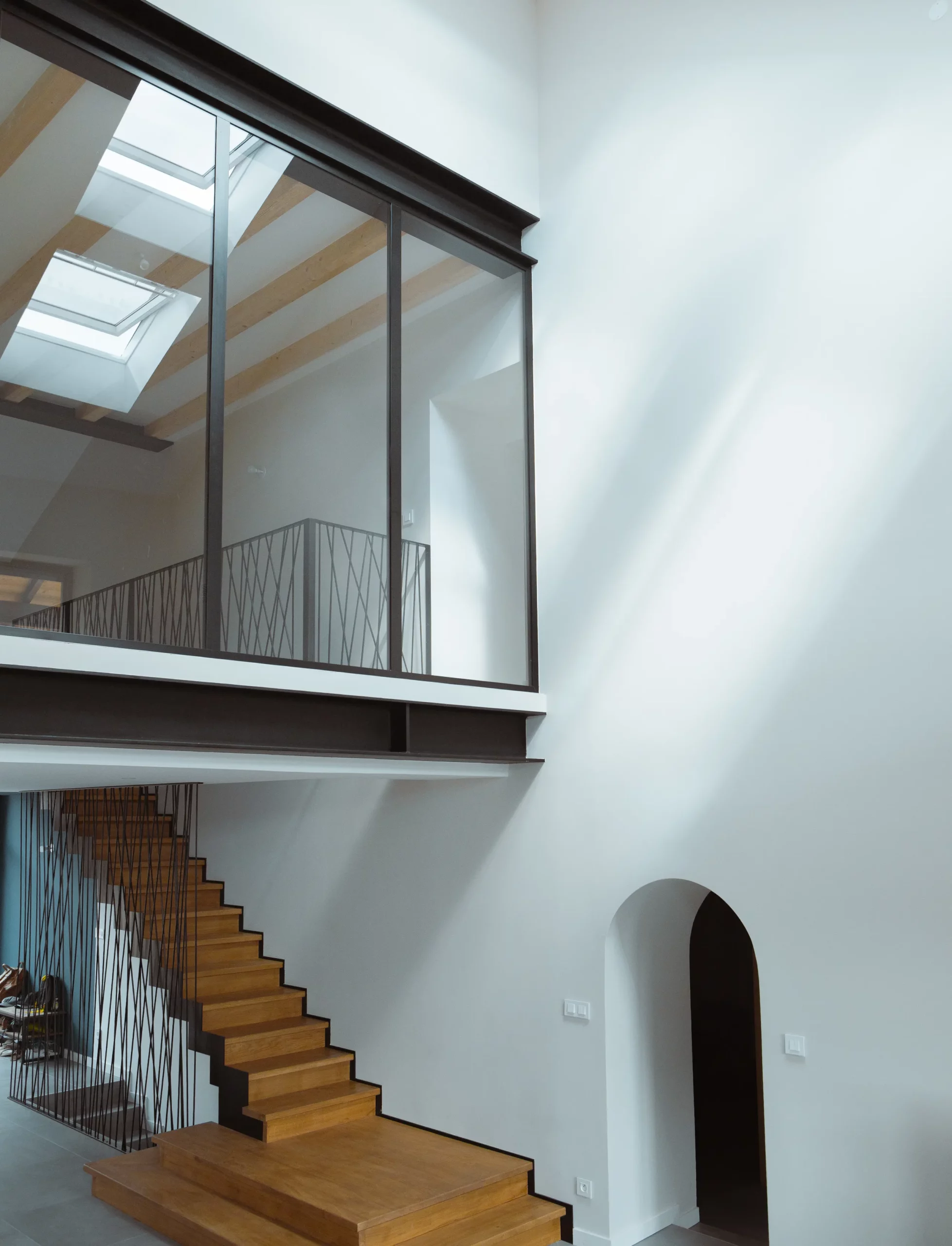 Un escalier sculptural accompagne la montée vers une mezzanine entièrement vitrée, suspendue au cœur du volume. Sa structure en acier apparent — IPN et garde-corps sur mesure composé de tiges métalliques soudées — affirme le caractère contemporain du projet tout en dialoguant avec l’existant.