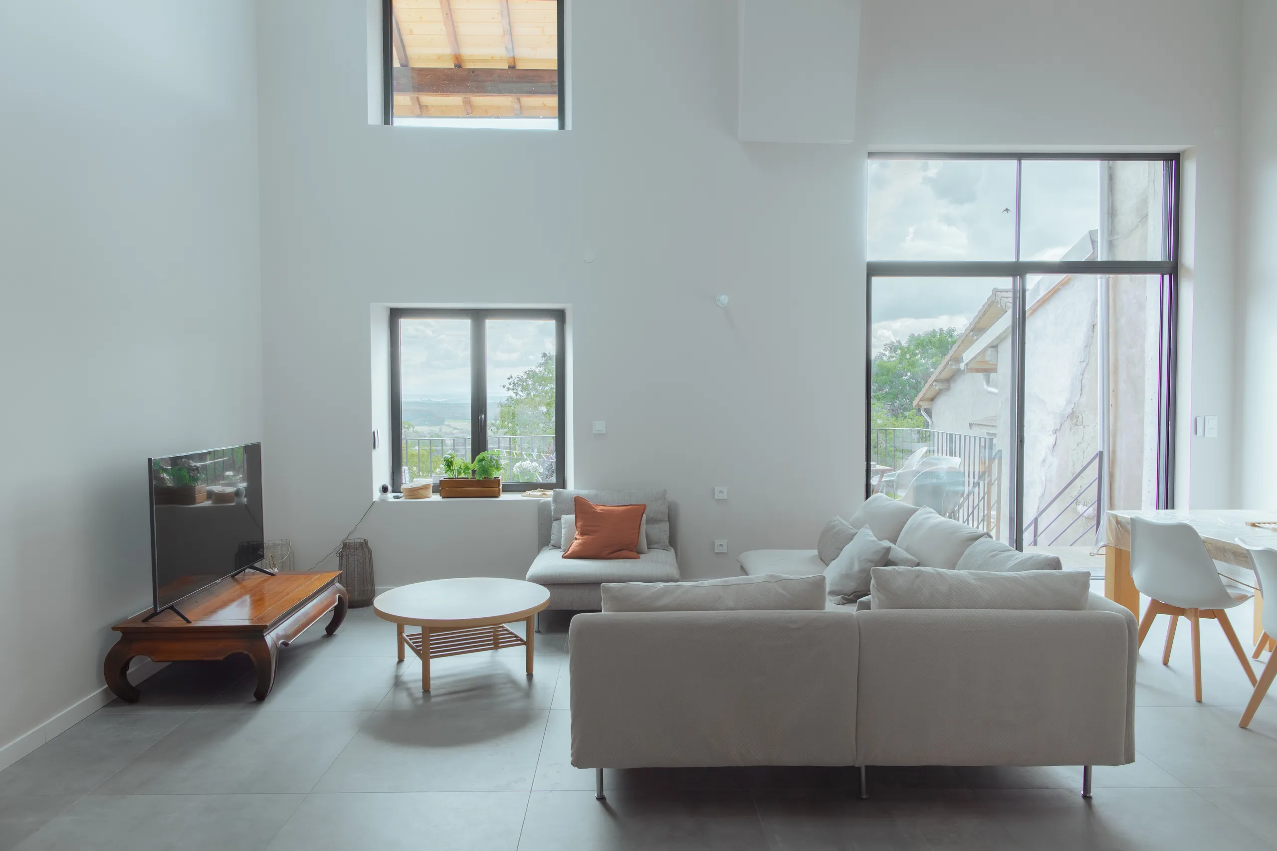 La réhabilitation de cette ancienne grange transforme le volume existant en un vaste espace de vie ouvert. Le séjour, traité en double hauteur, révèle toute la générosité du bâti et permet une lecture claire de la structure.
