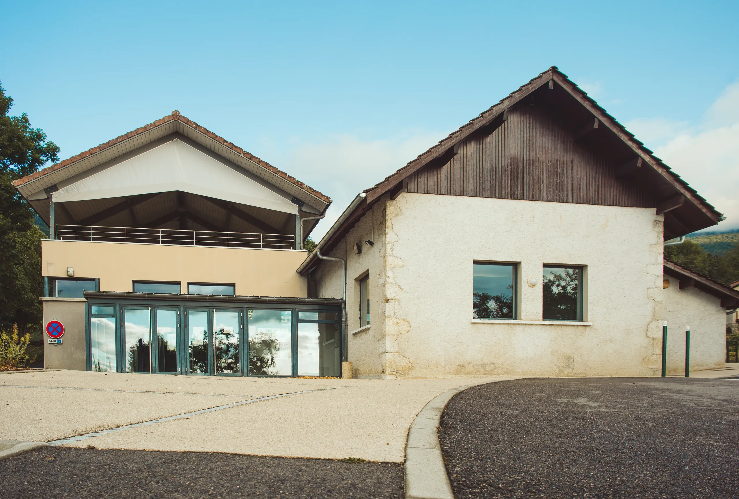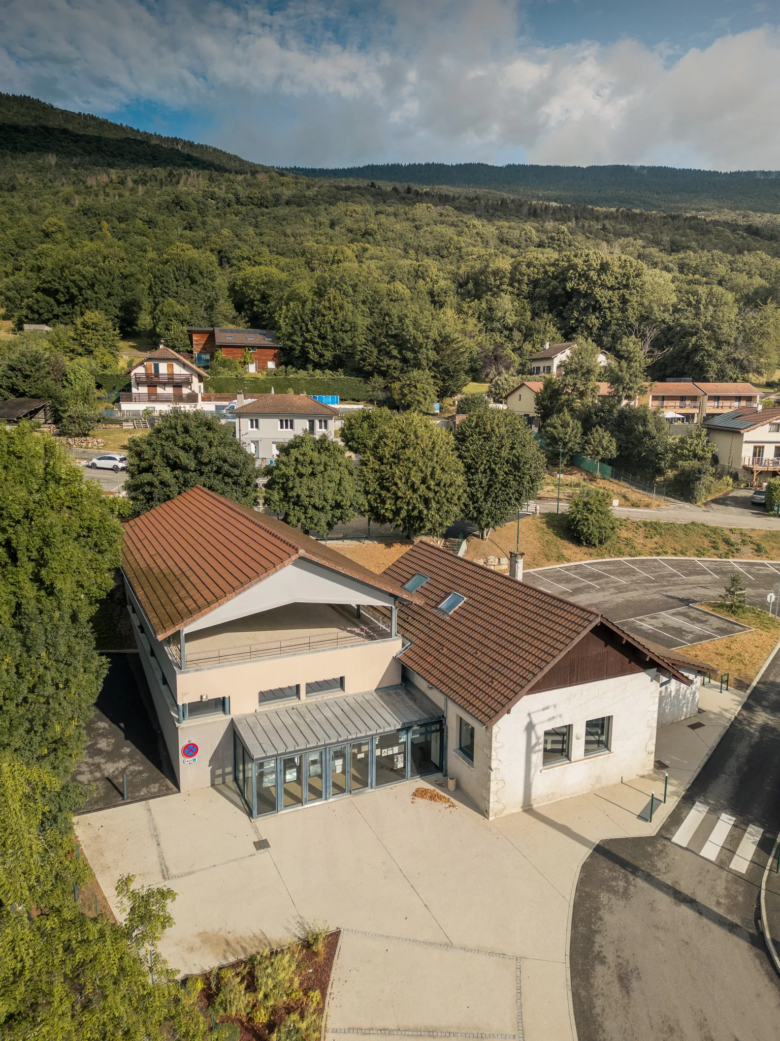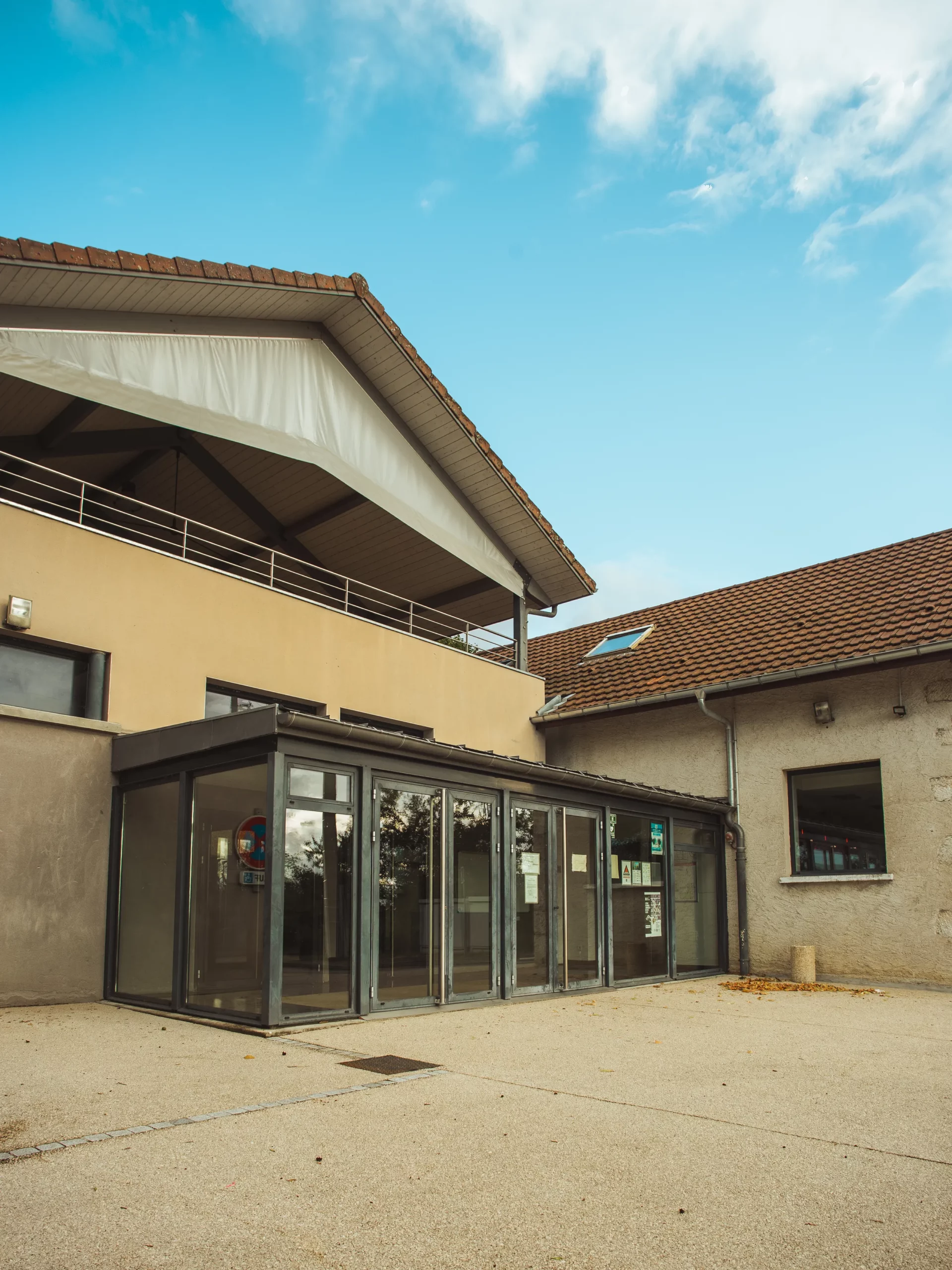 Le projet rénove et agrandit le bâtiment existant afin de proposer un équipement adapté aux usages contemporains. La construction s’inscrit dans la pente naturelle du site, permettant une intégration discrète et harmonieuse.