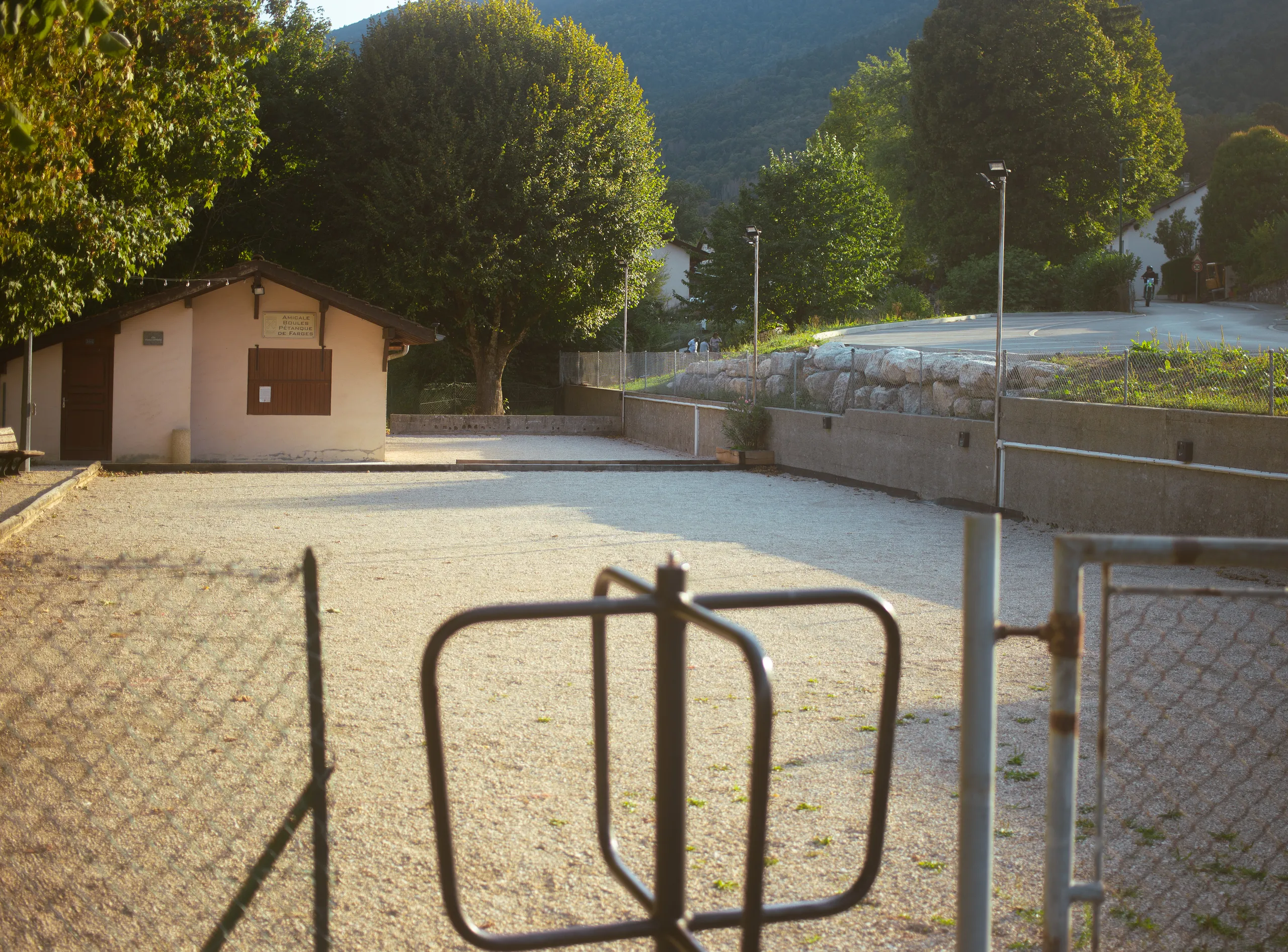 La toiture, aménagée en boulodrome couvert par une structure bois, offre une vue panoramique sur le bassin genevois et transforme le toit en véritable espace de vie. À l’intérieur, la salle se divise en deux espaces principaux, complétés par le bar et la cuisine, pour répondre aux usages culturels, festifs et associatifs du village.