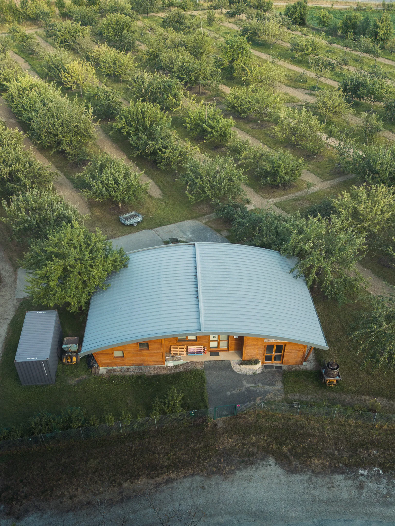 Implanté au cœur du site du Verger Tiocan, le nouveau bâtiment en ossature bois accompagne l’évolution du lieu et renforce son rôle pédagogique. Conçu comme un volume simple et lisible, il offre des espaces dédiés à l’accueil des visiteurs, aux activités de formation et au stockage des outils et des récoltes. Sa construction en bois et sa relation directe avec le paysage en font un équipement en continuité avec l’identité naturelle du site.